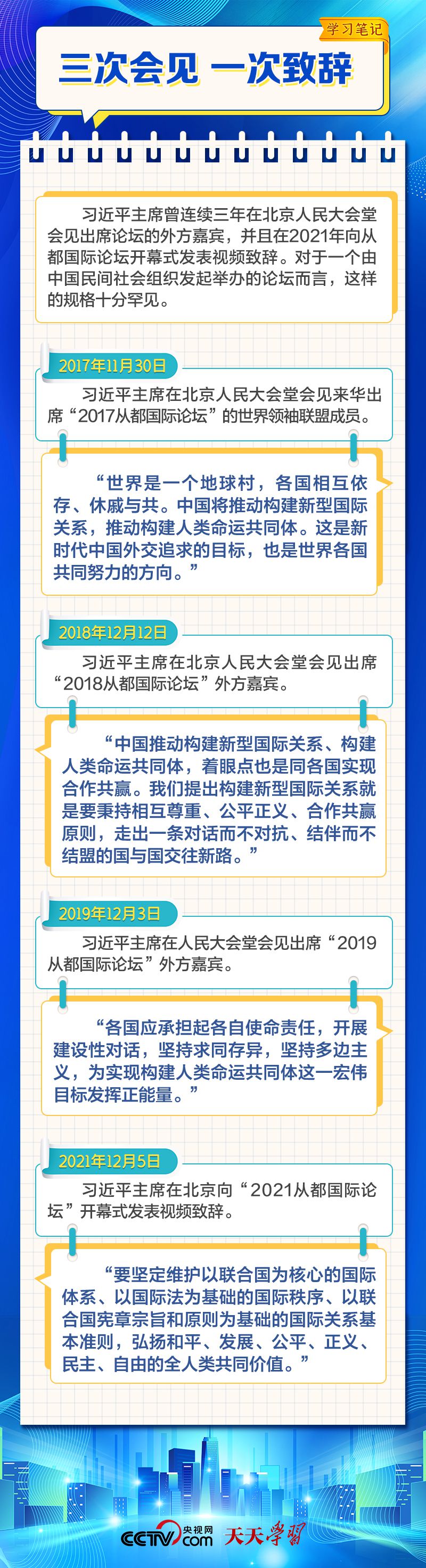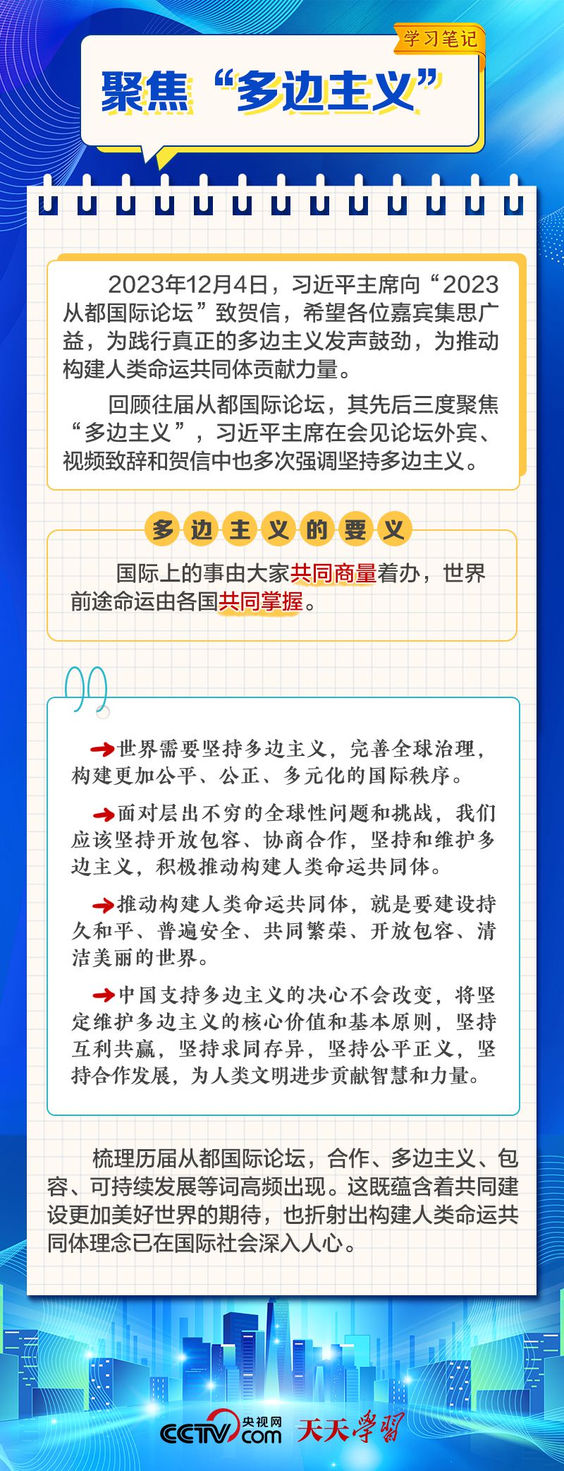天天學習(xi) 12月4日,習(xi) 近平主席在致“2023從(cong) 都國際論壇”的賀信中強調,麵對前所未有的世界之變、時代之變和曆史之變,人類社會(hui) 必須團結起來,堅持互學互鑒、開放包容、合作共贏,弘揚全人類共同價(jia) 值,共同建設更加美好的世界。