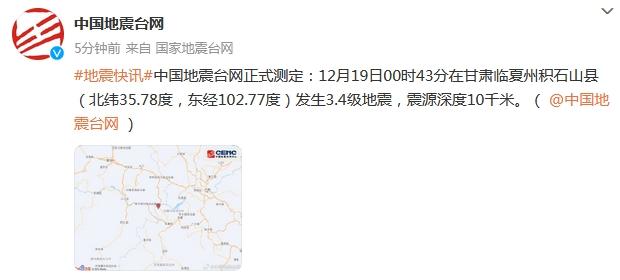 中新網12月19日電 據中國地震台網中心官方微博消息,中國地震台網正式測定:12月19日0時43分在甘肅臨(lin) 夏州積石山縣(北緯35.78度,東(dong) 經102.77度)發生3.4級地震,震源深度10千米。