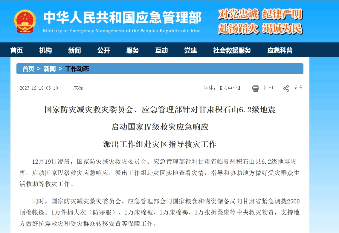 中新網12月19日電 據應急管理部網站消息,12月19日淩晨,國家防災減災救災委員會(hui) 、應急管理部針對甘肅省臨(lin) 夏州積石山縣6.2級地震災害,啟動國家Ⅳ級救災應急響應,派出工作組赴災區實地查看災情,指導和協助地方做好受災群眾(zhong) 生活救助等救災工作。