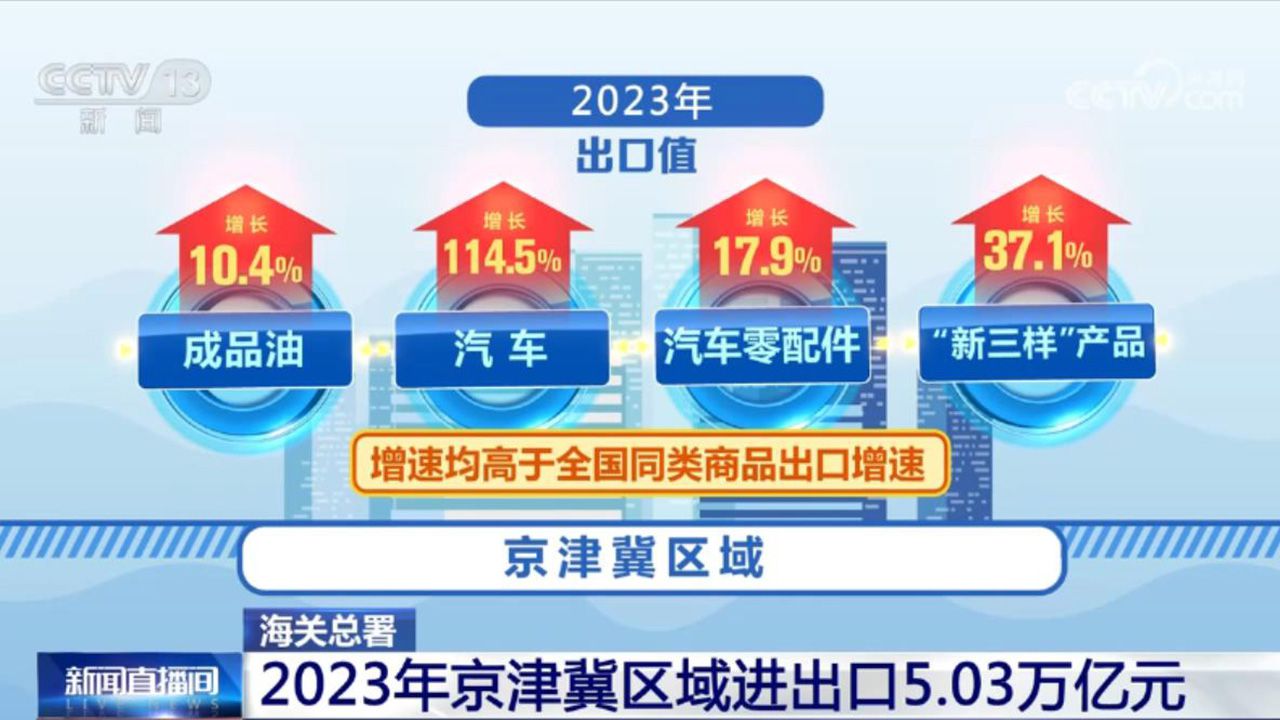 在出口方麵,2023年京津冀區域出口1.31萬(wan) 億(yi) 元,增長2.5%,占全國出口總值的5.5%,其中,成品油、汽車、汽車零配件、“新三樣”產(chan) 品的出口值分別增長10.4%、114.5%、17.9%、37.1%,增速均高於(yu) 全國同類商品出口增速。