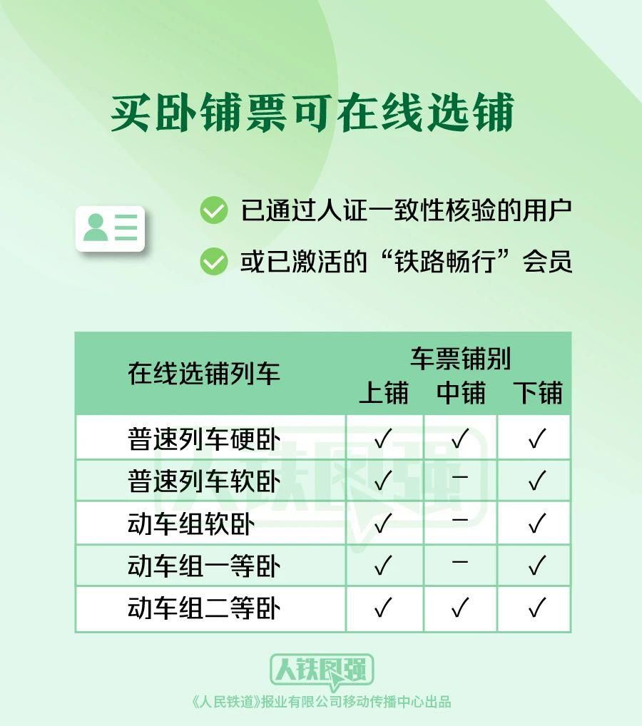 旅客在鐵路12306網站和App上購買(mai) 臥鋪車票時,普速列車軟臥、硬臥和動車組軟臥、一等臥、二等臥等鋪別可在線自主選鋪。