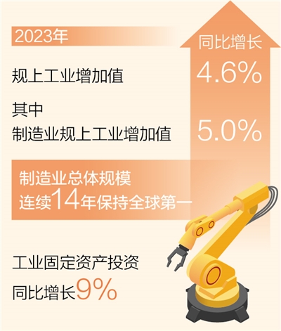 本報北京1月21日電 (記者王政、劉溫馨)記者日前從(cong) 工業(ye) 和信息化部獲悉:2023年,全年規模以上工業(ye) 增加值同比增長4.6%,較2022年提升1個(ge) 百分點,其中製造業(ye) 規模以上工業(ye) 增加值同比增長5.0%,我國製造業(ye) 總體(ti) 規模連續14年保持全球第一。