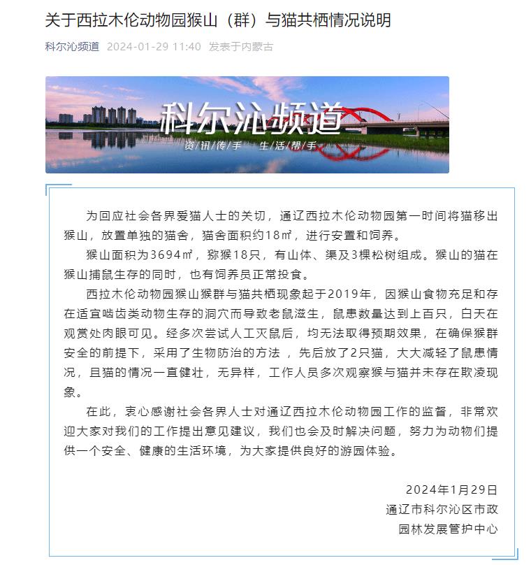 中新網1月29日電 據內(nei) 蒙古通遼市科爾沁區融媒體(ti) 中心微信公眾(zhong) 號消息,通遼市科爾沁區市政園林發展管護中心29日發布《關(guan) 於(yu) 西拉木倫(lun) 動物園猴山(群)與(yu) 貓共棲情況說明》(下稱“情況說明”)。情況說明顯示,通遼西拉木倫(lun) 動物園已第一時間將貓移出猴山,且貓的情況一直健壯,無異樣,工作人員多次觀察猴與(yu) 貓並未存在欺淩現象。全文如下:
