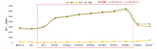 預計春節期間全國高速公路客車日均流量約4890萬(wan) 輛,小客車占客車比例預計達99%以上。貨車流量在春節節前逐日下降,在正月初一達到最低值,春節假期之後逐漸恢複到日常水平,但貨車流量同比去年預計有所增長。