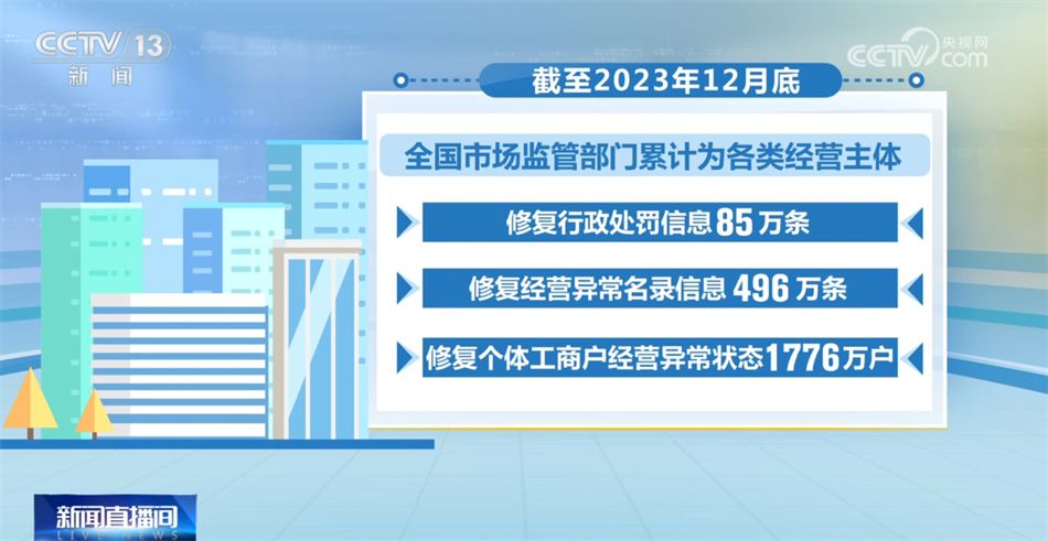 截至2023年12月底,全國市場監管部門累計為(wei) 各類經營主體(ti) 修複行政處罰信息85萬(wan) 條,修複經營異常名錄信息496萬(wan) 條,修複個(ge) 體(ti) 工商戶經營異常狀態1776萬(wan) 戶。