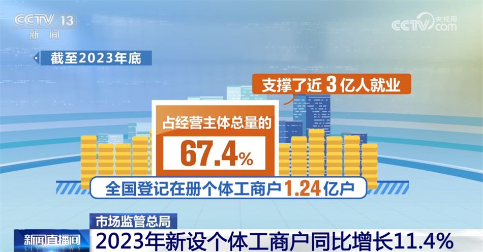 截至2023年底,全國登記在冊(ce) 個(ge) 體(ti) 工商戶1.24億(yi) 戶,占經營主體(ti) 總量的67.4%,支撐了近3億(yi) 人就業(ye) ;全年新設個(ge) 體(ti) 工商戶2258.2萬(wan) 戶,同比增長11.4%。
