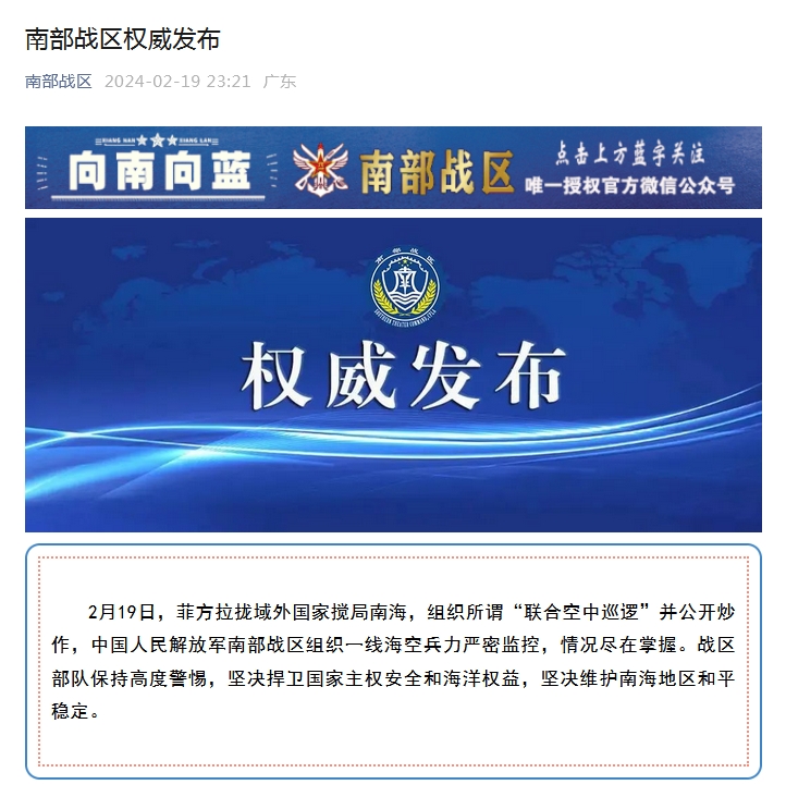 中新網2月19日電 據南部戰區微信公眾(zhong) 號消息,2月19日,菲方拉攏域外國家攪局南海,組織所謂“聯合空中巡邏”並公開炒作,中國人民解放軍(jun) 南部戰區組織一線海空兵力嚴(yan) 密監控,情況盡在掌握。戰區部隊保持高度警惕,堅決(jue) 捍衛國家主權安全和海洋權益,堅決(jue) 維護南海地區和平穩定。