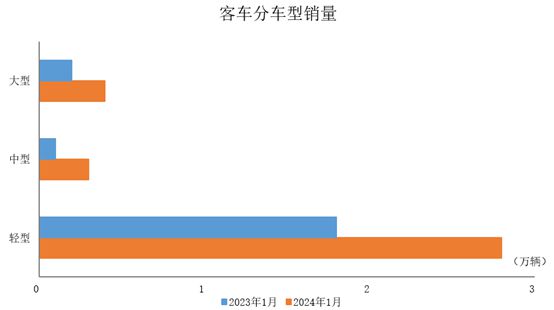 2024年1月,客車產(chan) 銷均完成3.5萬(wan) 輛,環比分別下降35.3%和36.5%,同比分別增長68.1%和63.4%。在客車細分品種中,與(yu) 上月相比,三大類客車品種產(chan) 銷均呈兩(liang) 位數下降;與(yu) 上年同期相比,三大類客車品種產(chan) 銷均呈不同程度增長。