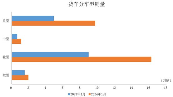 2024年1月,貨車產(chan) 銷分別完成29.2萬(wan) 輛和28.9萬(wan) 輛,環比分別下降6.4%和6.6%,同比分別增長65.9%和81.8%。在貨車細分品種中,與(yu) 上月相比,重型貨車和中型貨車產(chan) 銷明顯增長,輕型貨車和微型貨車產(chan) 銷呈兩(liang) 位數下降;與(yu) 上年同期相比,四大類貨車品種產(chan) 銷均呈不同程度增長。