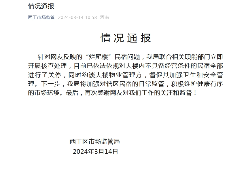 針對網友反映的“爛尾樓”民宿問題,西工區市場監管局聯合相關(guan) 職能部門立即開展核查處理,目前已依法依規對大樓內(nei) 不具備經營條件的民宿全部進行了關(guan) 停,同時約談大樓物業(ye) 管理方,督促其加強衛生和安全管理。