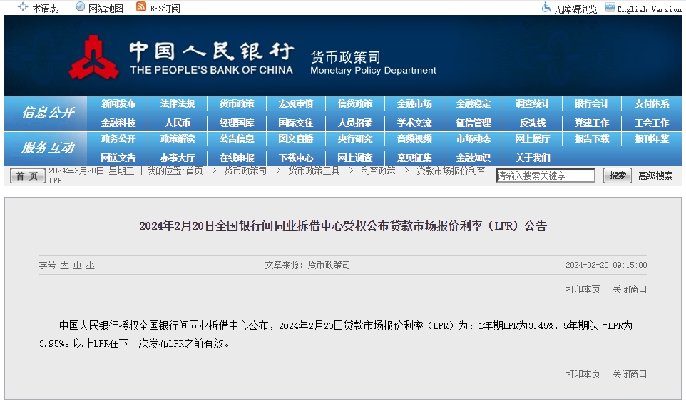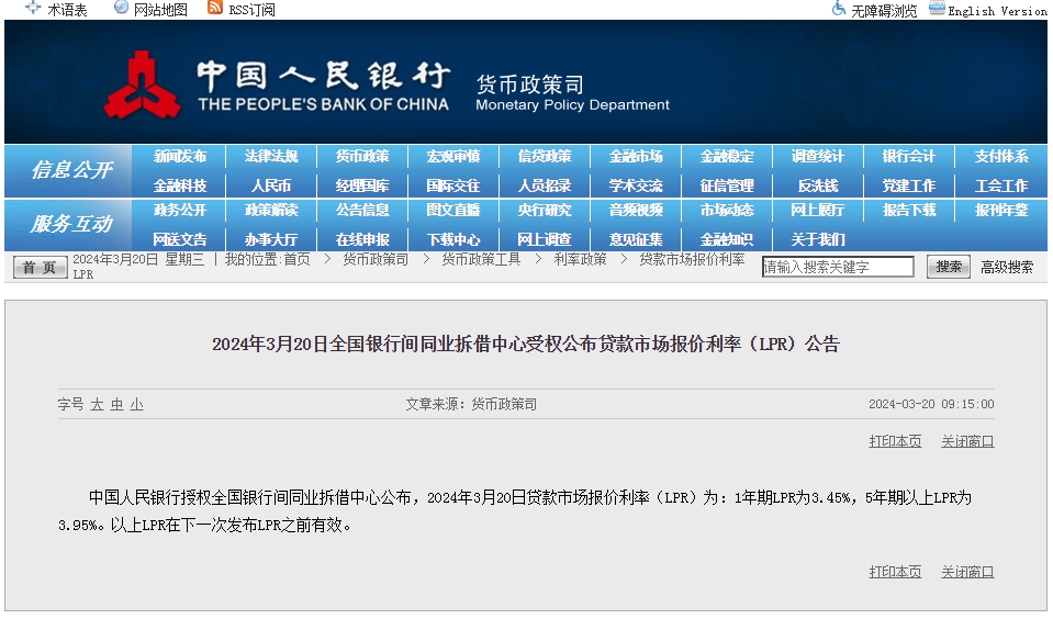 中新網3月20日電 據中國人民銀行網站消息,中國人民銀行授權全國銀行間同業(ye) 拆借中心公布,2024年3月20日貸款市場報價(jia) 利率(LPR)為(wei) :1年期LPR為(wei) 3.45%,5年期以上LPR為(wei) 3.95%。以上LPR在下一次發布LPR之前有效。3月LPR與(yu) 2月保持一致,未作調整。