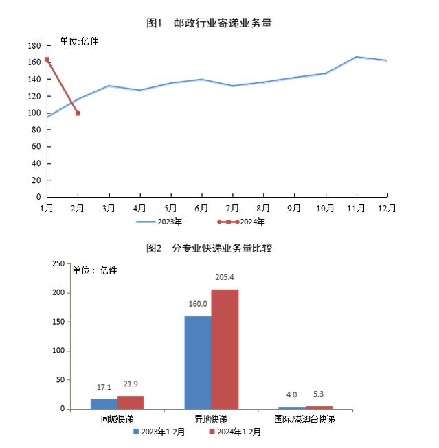 1-2月,同城快遞業(ye) 務量完成21.9億(yi) 件,同比增長28.3%;異地快遞業(ye) 務量完成205.4億(yi) 件,同比增長28.5%;國際/港澳台快遞業(ye) 務量完成5.3億(yi) 件,同比增長31.9%。