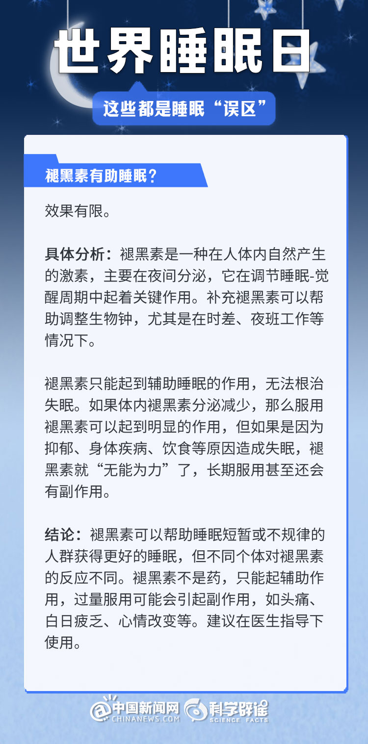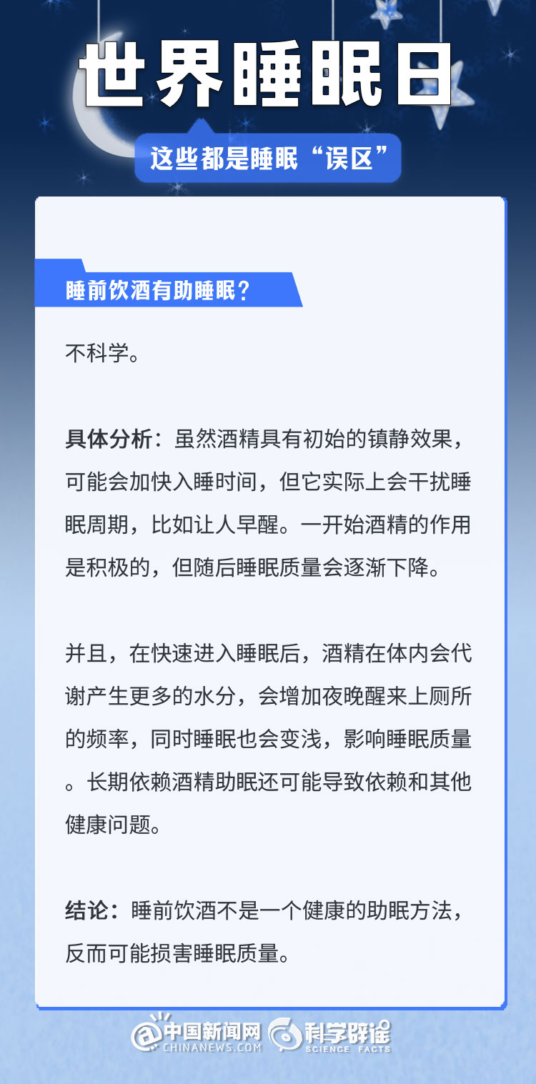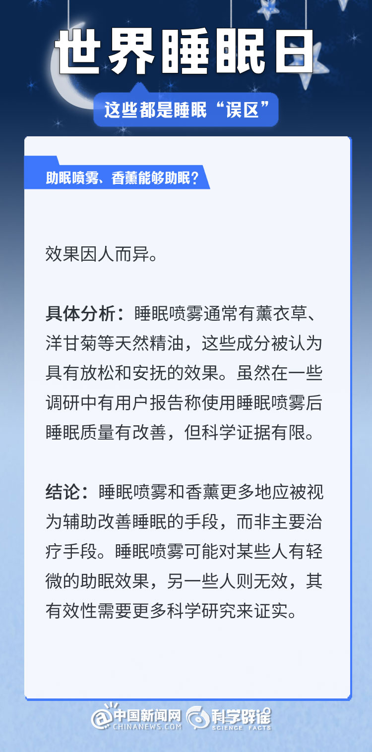 中新網3月21日電 《中國睡眠研究報告(2024)》顯示,2023年居民睡眠指數為(wei) 62.61分,較2022年降低了5.16。去年的報告中,曾有近半數民眾(zhong) 每晚平均睡眠時長不足8小時(47.55%)。很多人正在經受著睡眠問題的困擾,為(wei) 了避免大家被誤導,我們(men) 總結了幾個(ge) 生活中常見的睡眠誤區,一起來了解一下吧!(來源:科學辟謠 中國新聞網微博)