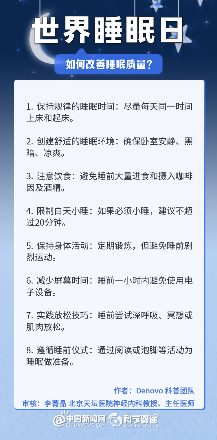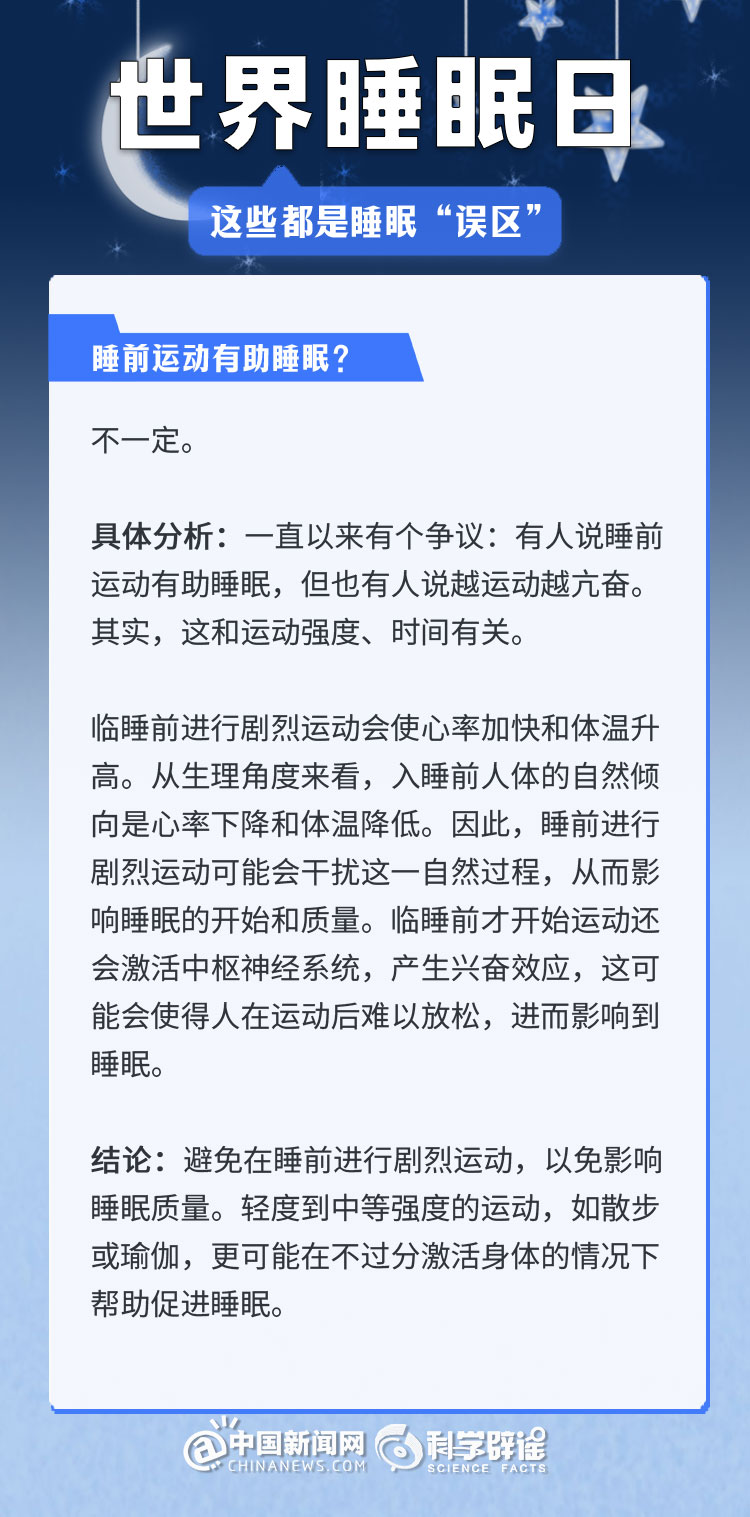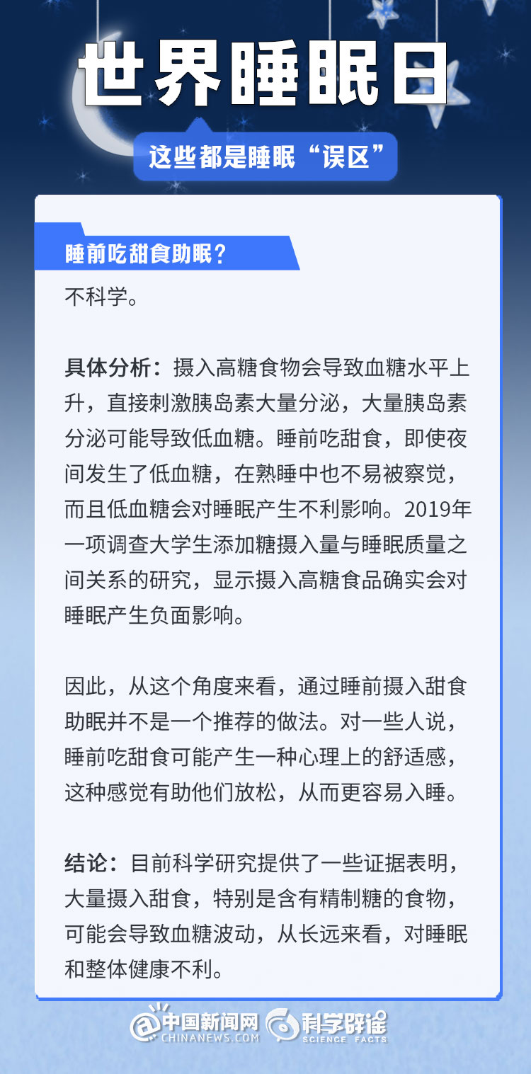 中新網3月21日電 《中國睡眠研究報告(2024)》顯示,2023年居民睡眠指數為(wei) 62.61分,較2022年降低了5.16。去年的報告中,曾有近半數民眾(zhong) 每晚平均睡眠時長不足8小時(47.55%)。很多人正在經受著睡眠問題的困擾,為(wei) 了避免大家被誤導,我們(men) 總結了幾個(ge) 生活中常見的睡眠誤區,一起來了解一下吧!(來源:科學辟謠 中國新聞網微博)