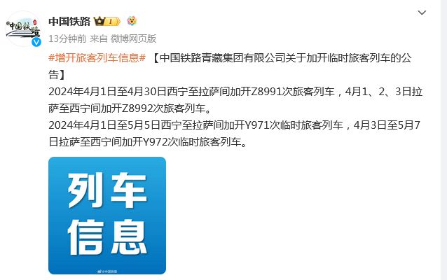 中新網3月22日電 據中國國家鐵路集團有限公司官方微博消息,中國鐵路青藏集團有限公司3月22日發布關(guan) 於(yu) 加開臨(lin) 時旅客列車的公告:2024年4月1日至4月30日西寧至拉薩間加開Z8991次旅客列車,4月1、2、3日拉薩至西寧間加開Z8992次旅客列車。2024年4月1日至5月5日西寧至拉薩間加開Y971次臨(lin) 時旅客列車,4月3日至5月7日拉薩至西寧間加開Y972次臨(lin) 時旅客列車。