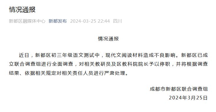 中新網3月26日電 據新都發布微信公眾(zhong) 號消息,成都市新都區聯合調查組25日發布情況通報稱,近日,新都區初三年級語文測試中,現代文閱讀材料造成不良影響。新都區已成立聯合調查組進行全麵調查,對相關(guan) 教研員及區教科院院長予以停職,並將根據調查結果、依據相關(guan) 規定對相關(guan) 責任人員進行嚴(yan) 肅處理。