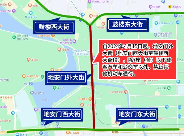 為(wei) 確保全國重點文物保護單位“大運河——玉河故道(澄清上閘含萬(wan) 寧橋)”的文物安全與(yu) 交通安全,根據文物保護和道路交通安全有關(guan) 法律法規規定,決(jue) 定自2024年4月15日起,地安門外大街(地安門西大街至鼓樓西大街段),除7座(含)以下載客汽車和公交車以外,禁止其他機動車通行。