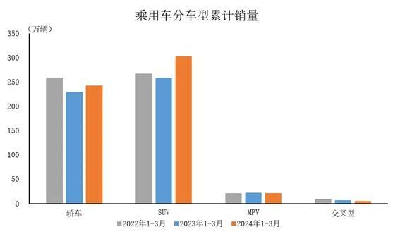 2024年1-3月,在乘用車主要品種中,與(yu) 上年同期相比,運動型多用途乘用車(SUV)產(chan) 銷呈兩(liang) 位數增長,基本型乘用車(轎車)產(chan) 銷小幅增長,多功能乘用車(MPV)和交叉型乘用車產(chan) 銷呈不同程度下降。