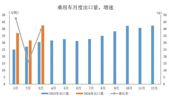 2024年3月,乘用車出口42.4萬(wan) 輛,環比增長34.6%,同比增長39.3%。