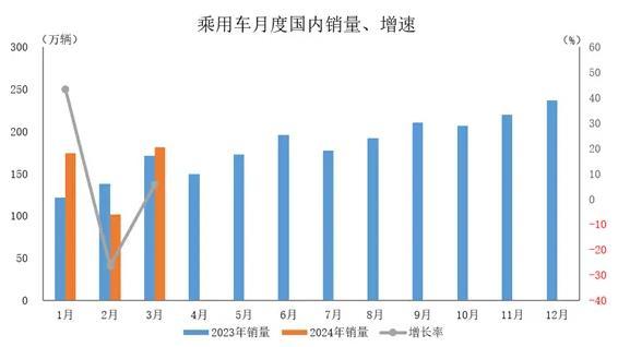 2024年3月,乘用車產(chan) 銷分別完成225萬(wan) 輛和223.6萬(wan) 輛,環比分別增長76.7%和67.8%,同比分別增長4.7%和10.9%。