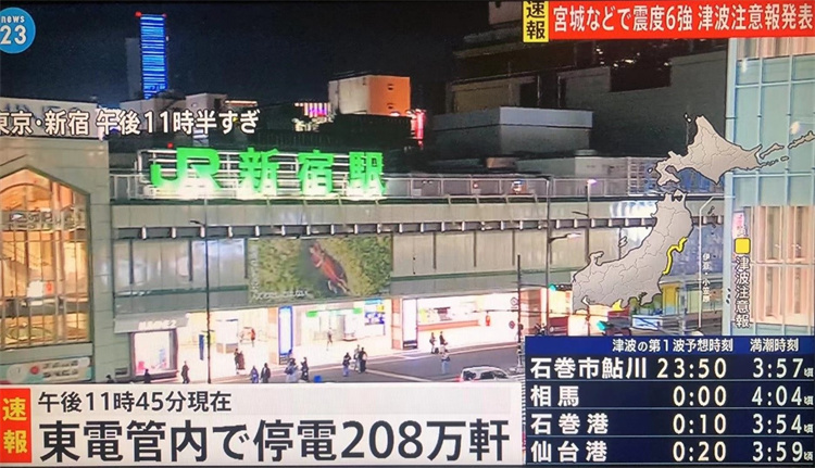 3月16日日本福島縣海域發生7.4級地震,導致大規模停電。圖片來源:日本電視台報道截圖