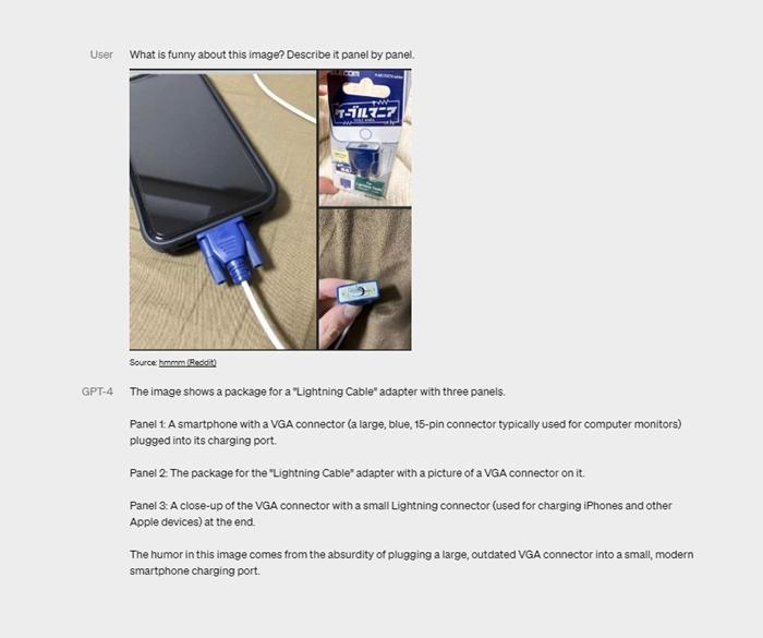 不過據OpenAI介紹,在輸入一張畫有VGA線連接手機充電接口內(nei) 容的圖像後,GPT-4除了能描述出這幅圖中的內(nei) 容,還能指出這張圖有哪些不對勁,“這幅圖中的幽默來自於(yu) 將一個(ge) 大的過時的VGA連接器插入一個(ge) 小的現代化的智能手機充電端口。”