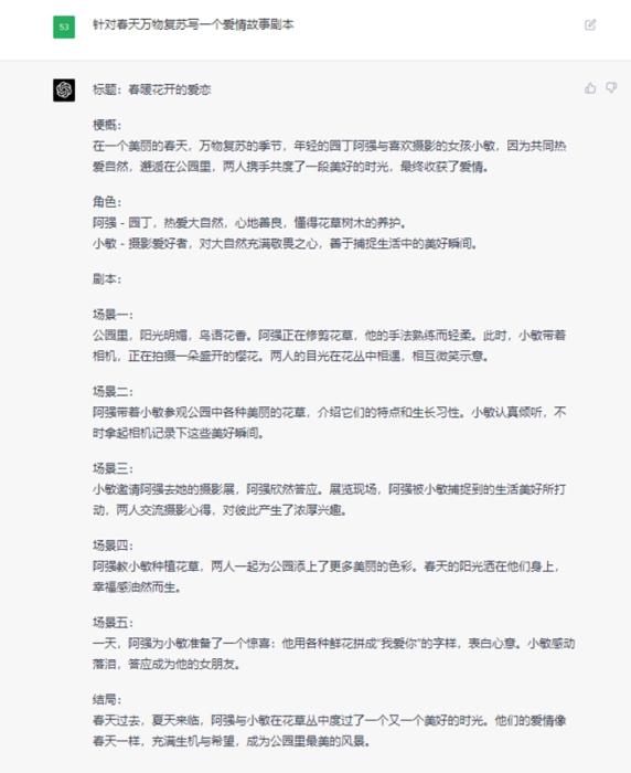 目前GPT-4僅(jin) 限於(yu) ChatGPT Plus訂戶使用。記者體(ti) 驗時發現,GPT-4生成速度比較慢,但回答簡明扼要,更有創造性,無論是寫(xie) 詩歌還是故事劇本都不在話下。例如它可以根據“春天萬(wan) 物複蘇”賦詩一首或者寫(xie) 成一個(ge) 愛情故事的劇本。