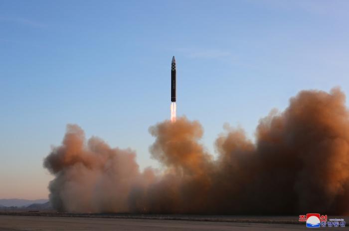 據報道,16日,“火星-17”型洲際彈道導彈在平壤國際機場發射,上升高度為(wei) 6045公裏,飛行距離達1000.2公裏,飛行時間為(wei) 4151秒,最後準確落在朝鮮東(dong) 海目標水域。