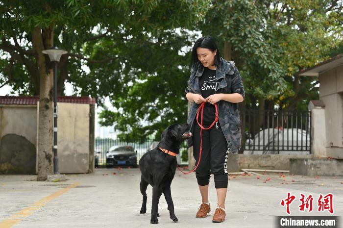 崔靜宜與(yu) 其訓練犬“肉排”互動。 俞靖 攝