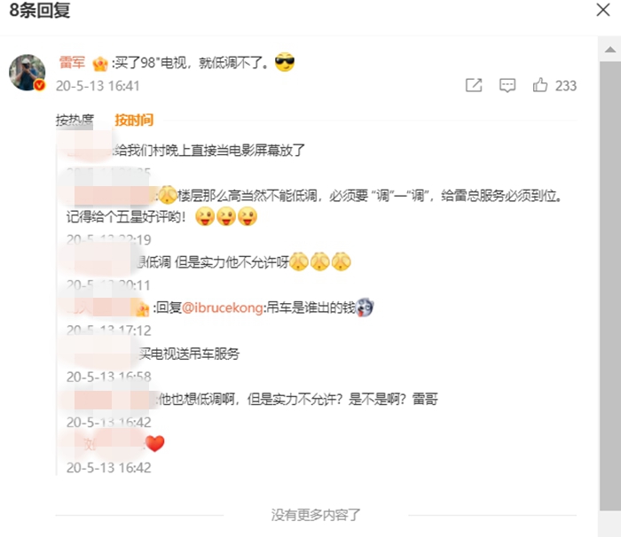2020年,購買(mai) 98英寸Redmi MAX 98的王先生安裝電視時動用了吊車,在網絡上引發關(guan) 注。當時小米之家用了相關(guan) 圖片刊發了微博,雷軍(jun) 還評論“買(mai) 了98"電視,就低調不了”。