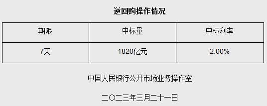 中新網3月21日電 據央行網站21日消息,為(wei) 維護銀行體(ti) 係流動性合理充裕,2023年3月21日人民銀行以利率招標方式開展了1820億(yi) 元逆回購操作,期限為(wei) 7天,中標利率為(wei) 2.00%。(中新財經)