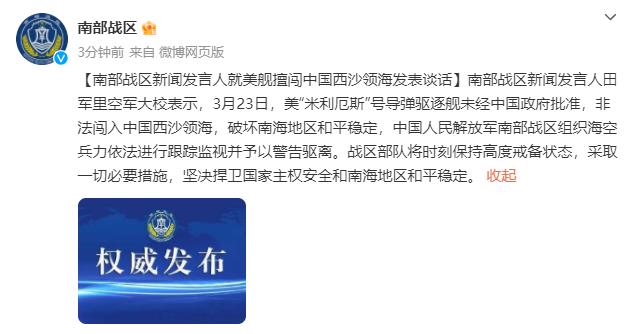 中新網3月23日電 據中國人民解放軍(jun) 南部戰區官方微博消息,南部戰區新聞發言人田軍(jun) 裏空軍(jun) 大校表示,3月23日,美“米利厄斯”號導彈驅逐艦未經中國政府批準,非法闖入中國西沙領海,破壞南海地區和平穩定,中國人民解放軍(jun) 南部戰區組織海空兵力依法進行跟蹤監視並予以警告驅離。戰區部隊將時刻保持高度戒備狀態,采取一切必要措施,堅決(jue) 捍衛國家主權安全和南海地區和平穩定。