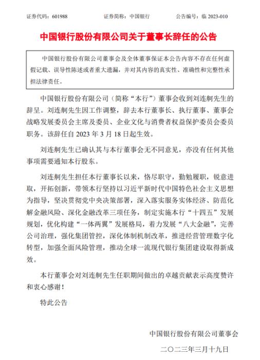 另外,19日,中國銀行公告稱,劉連舸因工作調整,辭去董事長、執行董事、董事會(hui) 戰略發展委員會(hui) 主席及委員、企業(ye) 文化與(yu) 消費者權益保護委員會(hui) 委員職務。