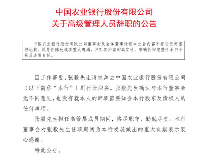 中國農(nong) 業(ye) 銀行也人事變動不斷。21日,農(nong) 行公告稱,因工作需要,張毅請求辭去中國農(nong) 業(ye) 銀行副行長職務。