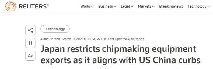但路透社認為(wei) ,日方的措施是為(wei) 了配合美國實施的針對中國的芯片出口管製措施。英國《金融時報》還稱,日本此舉(ju) 是在履行其與(yu) 美國和荷蘭(lan) 達成的、針對中國半導體(ti) 的三方協議。