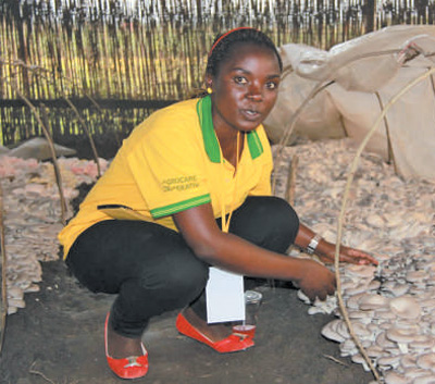 盧旺達國立大學的學生姍台在菇棚中采收平菇。