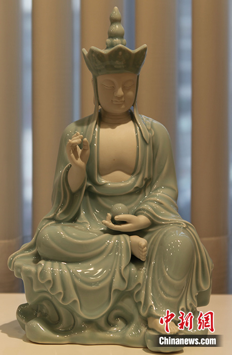 圖為(wei) 展品《地藏》,造型莊嚴(yan) 典雅,寧靜安詳。 中新社記者 德永健 攝