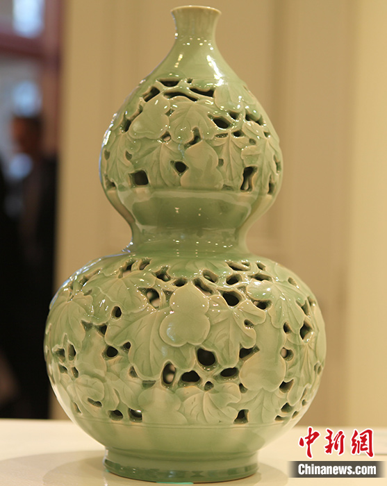 圖為(wei) 展品《葫蔭綿長》,因其燒製難度大,是公認的龍泉青瓷精品。 中新社記者 德永健 攝