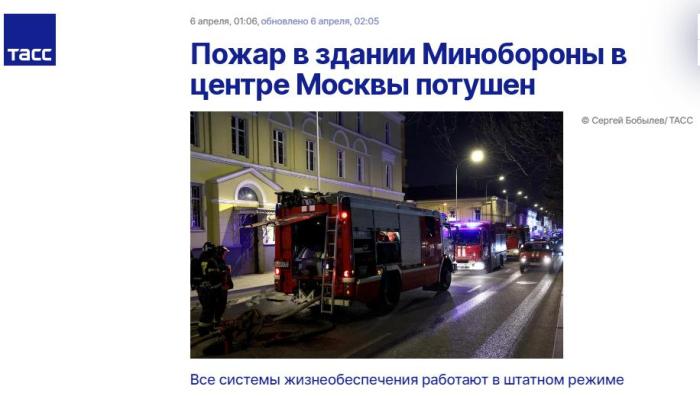 中新網4月6日電 據塔斯社報道,當地時間5日晚間,俄羅斯國防部位於(yu) 莫斯科茲(zi) 納門卡大街的一棟辦公大樓內(nei) 出現起火冒煙的情況,目前火勢已被撲滅,沒有人員受傷(shang) 。
