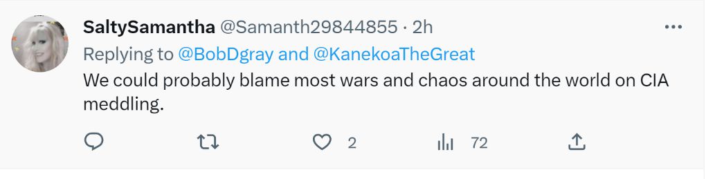 網友“有趣的薩曼莎”說:“世界上絕大多數的戰爭(zheng) 和混亂(luan) 都是美國中央情報局帶來的吧。”