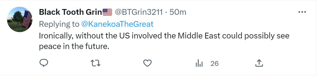 一名自我介紹是美國退役軍(jun) 人的網友“現身說法”:“真諷刺,沒有美國摻和,中東(dong) 或許未來就會(hui) 實現和平。”