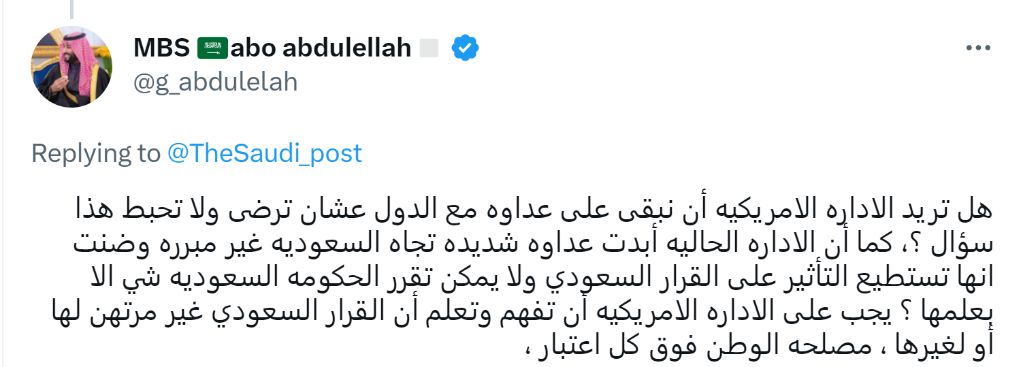 沙特網友阿博·阿卜杜勒拉言辭激烈地批評:“隻有我們(men) 與(yu) 其他國家保持敵意美國才不會(hui) 失望嗎?美國政府對沙特表現出強烈而無理的敵意,居然還認為(wei) 它可以影響沙特的決(jue) 定、沙特隻能在它的指導下做事?美國政府必須了解,沙特的決(jue) 定不依附於(yu) 任何其他人。祖國的利益高於(yu) 一切。”