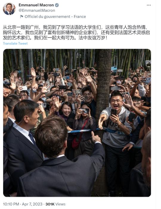 中新網4月8日電 北京時間4月7日,在中國訪問的法國總統馬克龍在社交媒體(ti) “推特”上,用中文、英語和法語分享了自己的訪華感受,並表示“法中友誼萬(wan) 歲!”