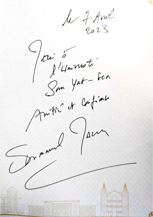 臨(lin) 別之時,馬克龍留下感言,為(wei) 中山大學題字:“感謝中山大學的友誼與(yu) 信任。埃馬紐埃爾·馬克龍,2023年4月7日。”