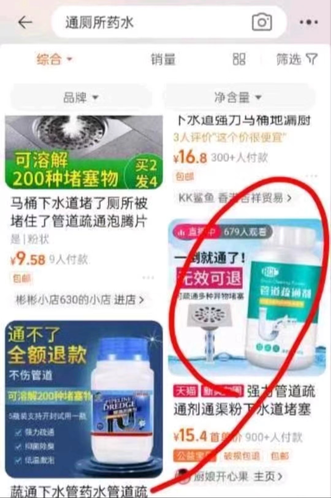 記者使用“官方疏通劑”、“通廁所藥水”等關(guan) 鍵詞在電商平台上進行搜索,每斤的價(jia) 格多在幾元至幾十元之間。