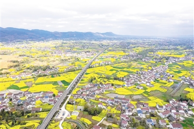 陝西省漢中市南鄭區嶽家嶺村,一列動車組列車在金燦燦的油菜花海中穿行。