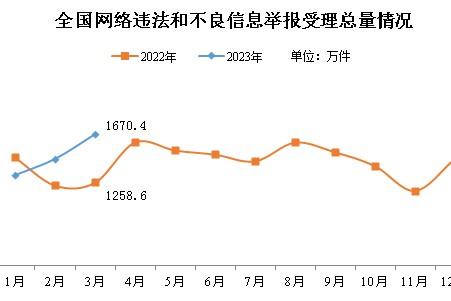 中新網4月11日電 據中央網信辦舉(ju) 報中心微信公眾(zhong) 號消息,2023年3月,中央網信辦舉(ju) 報中心指導全國各級網信舉(ju) 報工作部門、主要網站平台受理網民舉(ju) 報色情、賭博、侵權、謠言等違法和不良信息1670.4萬(wan) 件,環比增長14.4%、同比增長32.7%。其中,中央網信辦舉(ju) 報中心受理舉(ju) 報44.3萬(wan) 件,環比下降22.9%、同比增長19.1%;各地網信舉(ju) 報工作部門受理舉(ju) 報74.0萬(wan) 件,環比增長18.3%、同比下降12.3%;全國主要網站平台受理舉(ju) 報1552.2萬(wan) 件,環比增長15.8%、同比增長36.5%。
