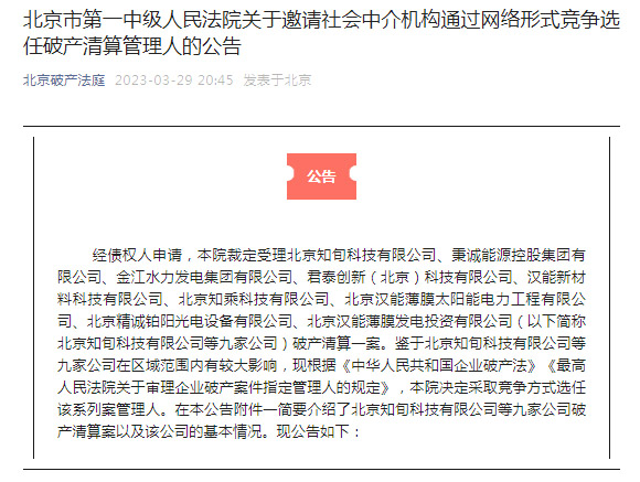經債(zhai) 權人申請,北京市第一中級人民法院裁定受理北京知旬科技有限公司、秉誠能源控股集團有限公司、金江水力發電集團有限公司、君泰創新(北京)科技有限公司、漢能新材料科技有限公司、北京知乘科技有限公司、北京漢能薄膜太陽能電力工程有限公司、北京精誠鉑陽光電設備有限公司、北京漢能薄膜發電投資有限公司破產(chan) 清算一案。