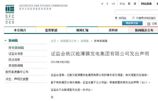 2015年5月28日,香港證監會(hui) 發表聲明稱,已就漢能薄膜發電的事務進行調查。2015年7月15日,漢能薄膜發電遭香港證監會(hui) 勒令停牌。