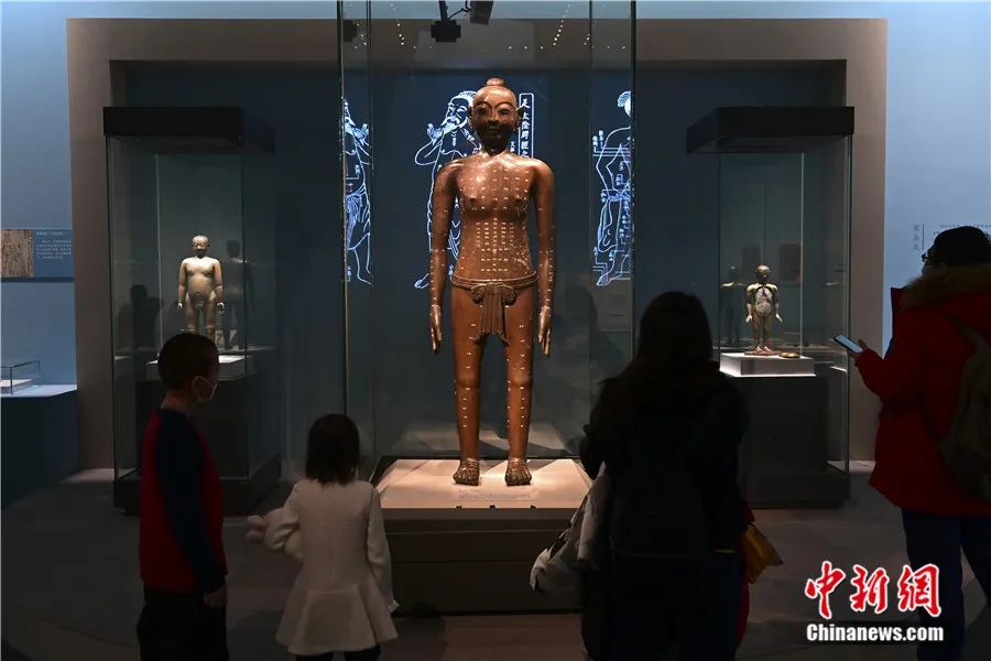 參觀者在中國國家博物館“智慧之光——中醫藥文化展”上觀看明仿宋針灸銅人。田雨昊 攝